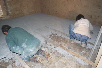 L'épaisseur de cette chape-dalle va varier de quelques cm au point haut à plus de 10 cm au point bas. Nous allons donc brasser beaucoup de matériaux pour recouvrir plusieurs dizaines de m2. Heureusemnt notre équipe ardéchoise est très bien outillée