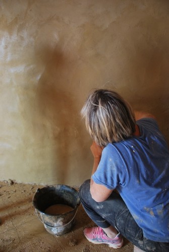 Une barbotine de terre a été posé su les pierre afin que notre mortier terre/paille/chaux/sable colle beaucoup plus facilement. Voici Nathalie (Guillaume a ensuite pris la suite).