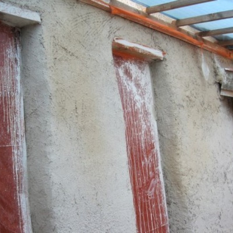 Ali avait donc préparé le mur en pisé, c'est à dire passé un mortier terre-paille-chaux. Le fait de passer un gobetis n'était pas absolument nécessaire mais plus prudent et intéressant dans le cadre de la formation.
