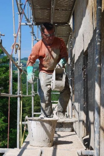 Sur l'échafaudage, le mortier est appliqué sans relâche. Il faut dire que c'est vraiment plaisant d'arriver rapidement à maîtriser une technique qui semblait difficile d'amblée. Jean ne s'arrête pas un instant et adore jouer avec la poulie