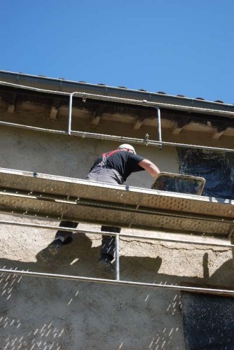 Nous commençons donc par installer un petit échafaudage de quelques mètres carrés afin de décrouter partiellement la façade :